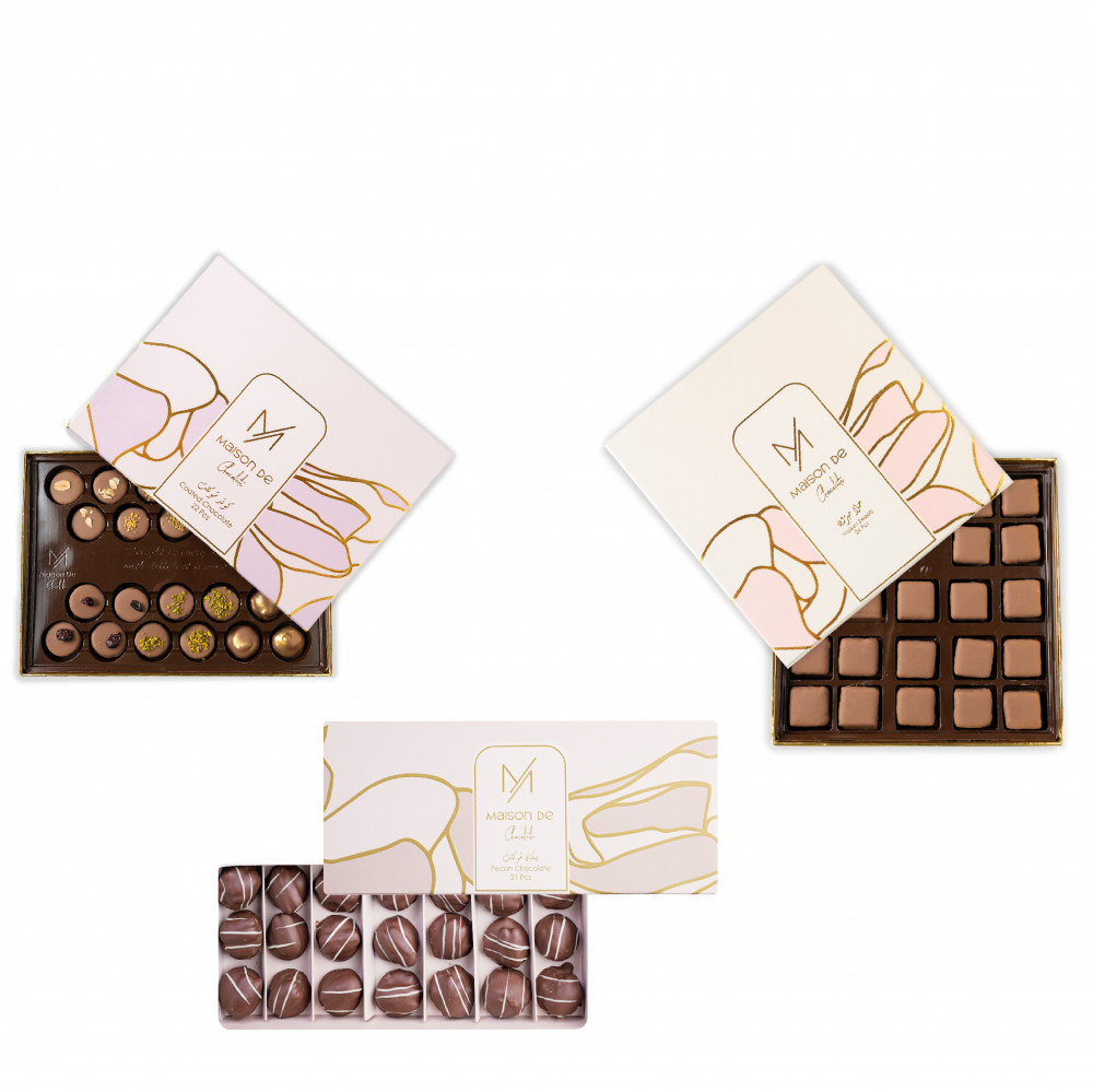 - محتويات العبوة : يحتوي على منتجات (حلا ميزون 24 قطعة - بيكان شوكلت 21 قطعة - كوتد شوكلت 22 قطعة )