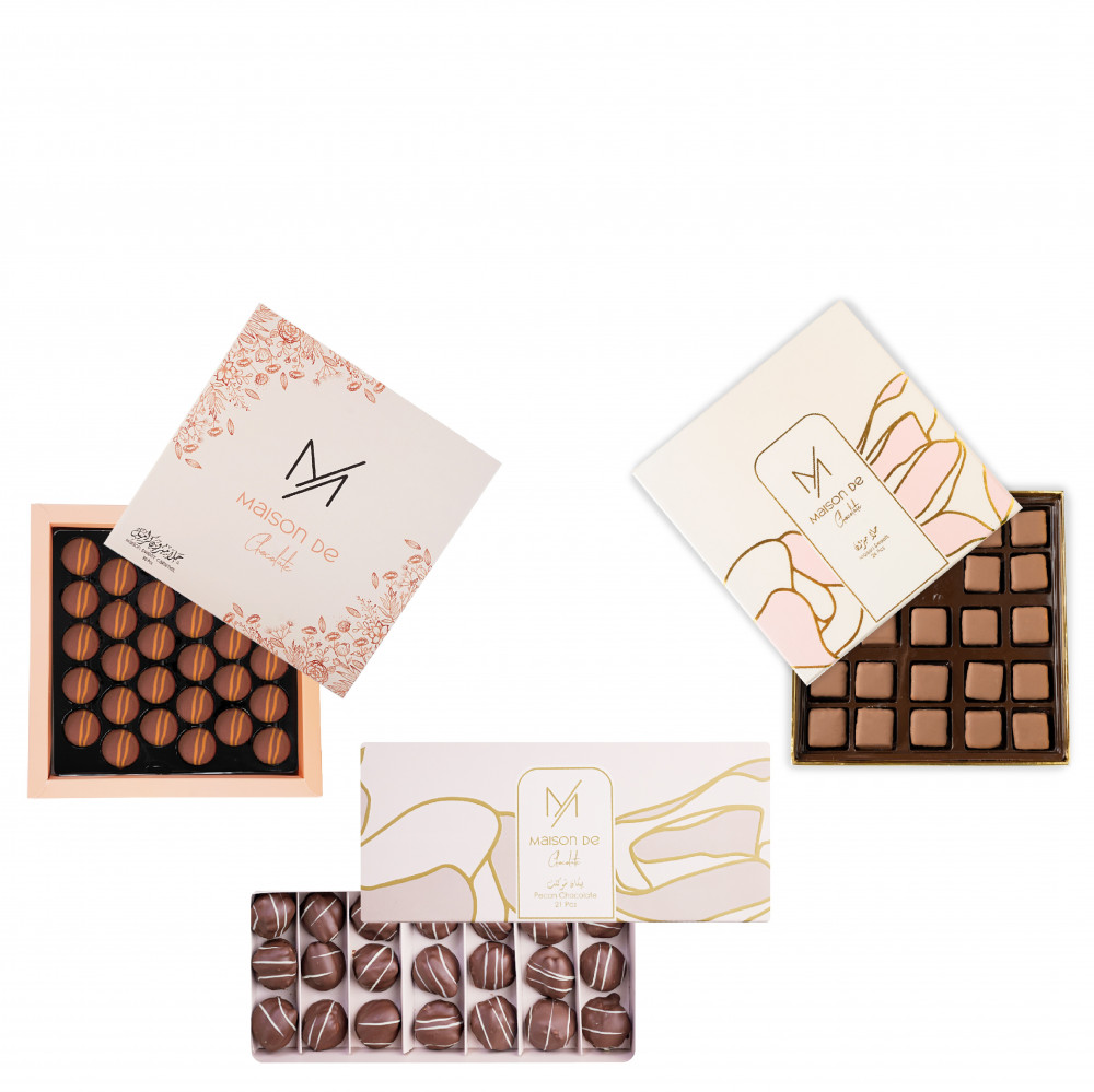 يحتوي على منتجات (حلا ميزون 24 قطعة - بيكان شوكلت 21 قطعة - حلا ميزون كراميل 30 قطعة )